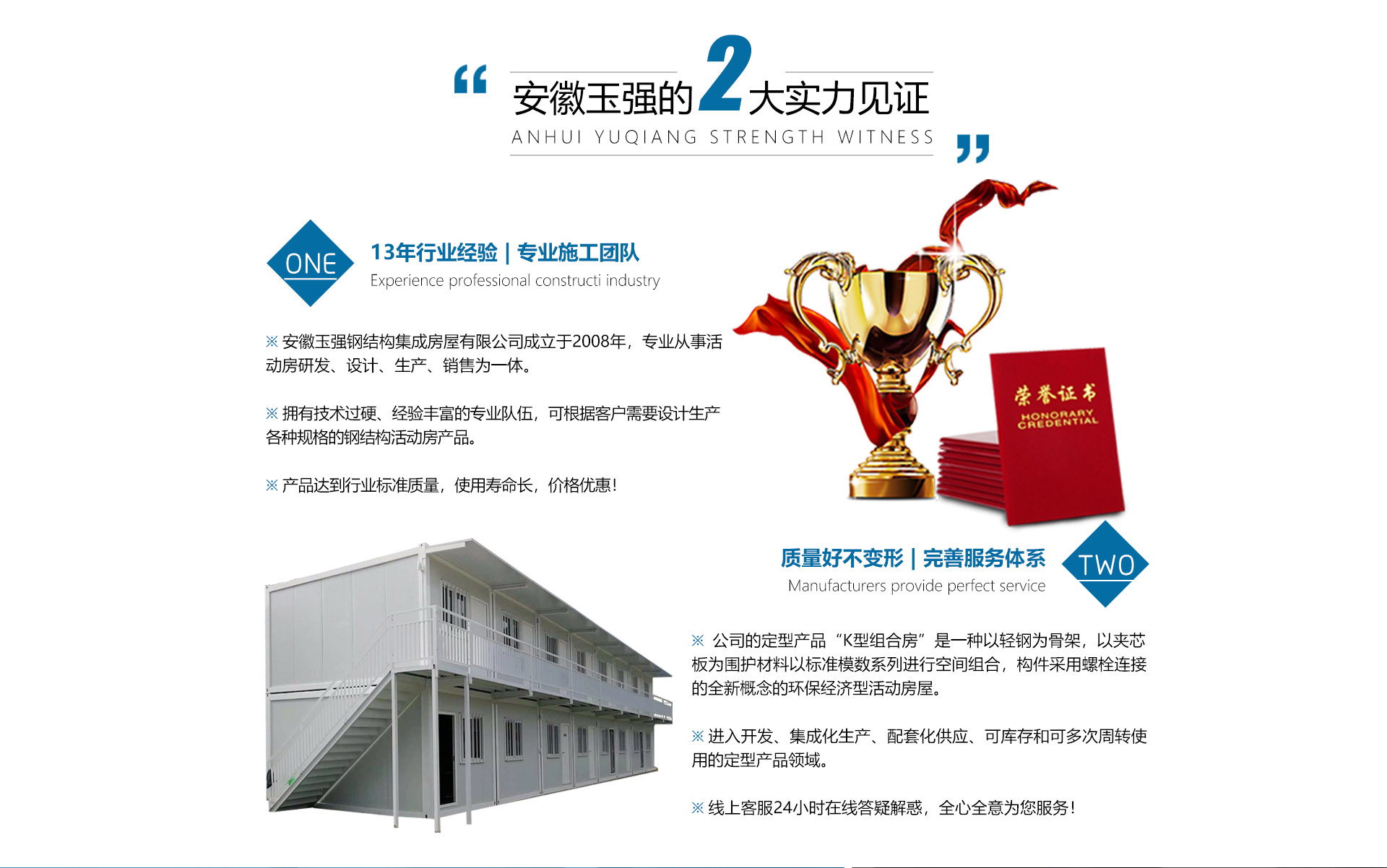 關(guān)于我們安徽玉強(qiáng)鋼結(jié)構(gòu)集成房屋有限公司是一家集研發(fā)、設(shè)計(jì)、生產(chǎn)、銷(xiāo)售服務(wù)于一體的活動(dòng)房與集裝箱制造企業(yè),公司隊(duì)伍具有多年鋼結(jié)構(gòu)制作及產(chǎn)品檢測(cè)經(jīng)驗(yàn),嚴(yán)格按照鋼結(jié)構(gòu)標(biāo)準(zhǔn)要求制作、檢測(cè)。致力于提供研、產(chǎn)、銷(xiāo)、于一體,有著多年積累的先進(jìn)生產(chǎn)技術(shù)和豐富工作經(jīng)驗(yàn),采用精良的工藝技術(shù),生產(chǎn)美觀(guān)大方的定型產(chǎn)品,長(zhǎng)期以來(lái),受廣大用戶(hù)的信賴(lài)和支持。歡迎您的來(lái)電咨詢(xún)。